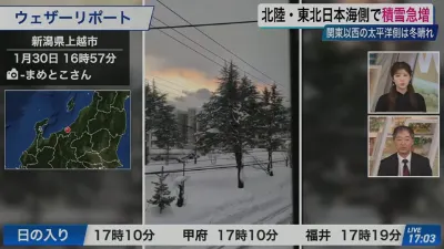 【ライブ】最新天気ニュース・地震情報 2026年1月30日(金) /北陸や東北日本海側で積雪急増に警戒 関東は昼間も真冬の寒さ〈ウェザーニュースLiVEアフタヌーン・小川千奈/宇野沢達也〉
